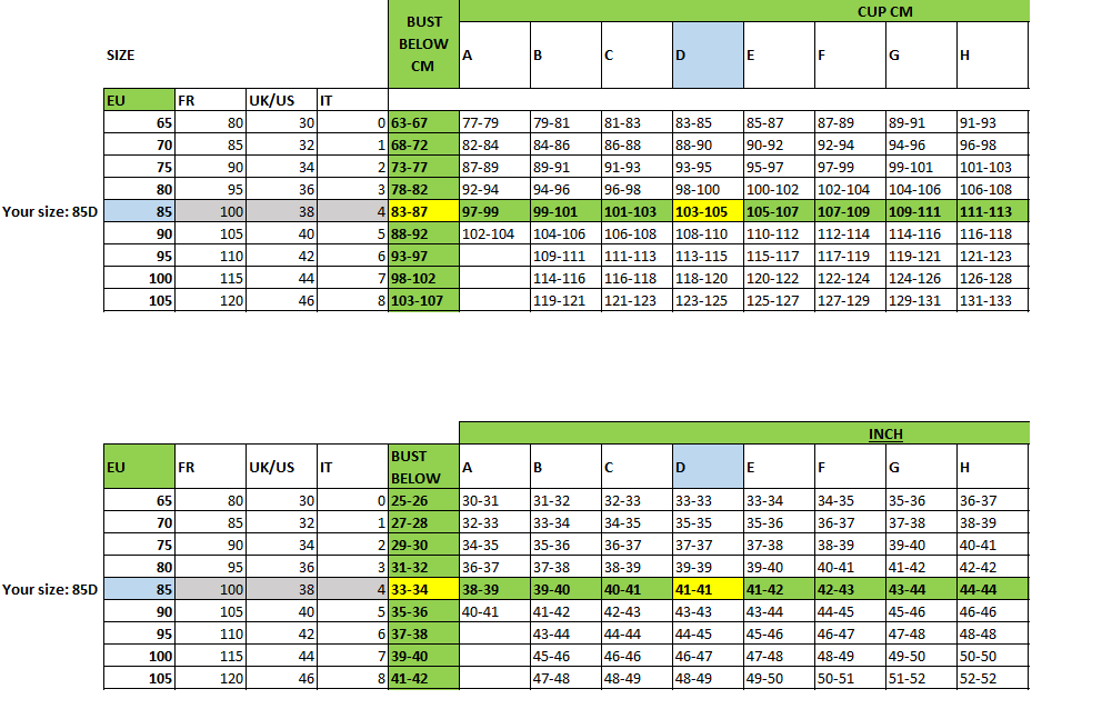 Näiteks, kui tavaliselt kannad 90C, aga rinnahoidja riba on liiga lõtv, kuid soovid säilitada sama korvi mahtu, proovi alternatiivset suurust 85D. Kui riba on liiga kitsas, vali suurem riba ja väiksem korv, näiteks 95B.
